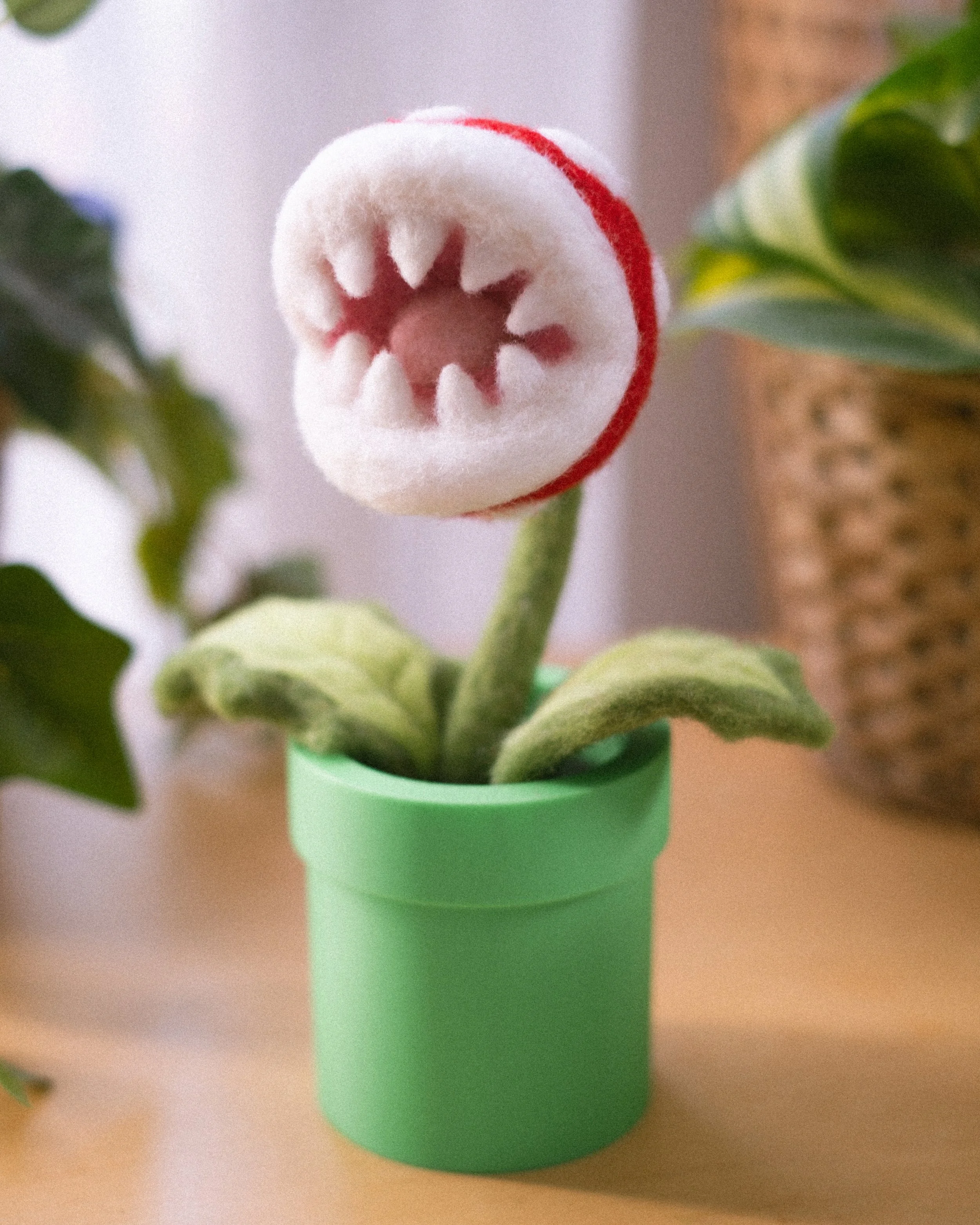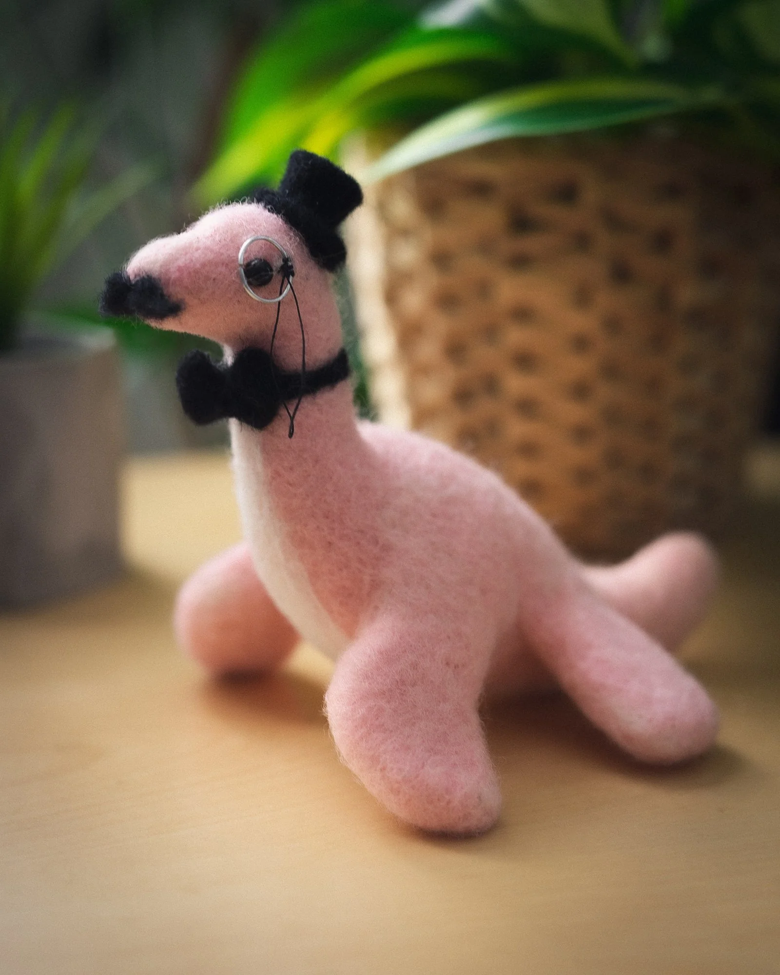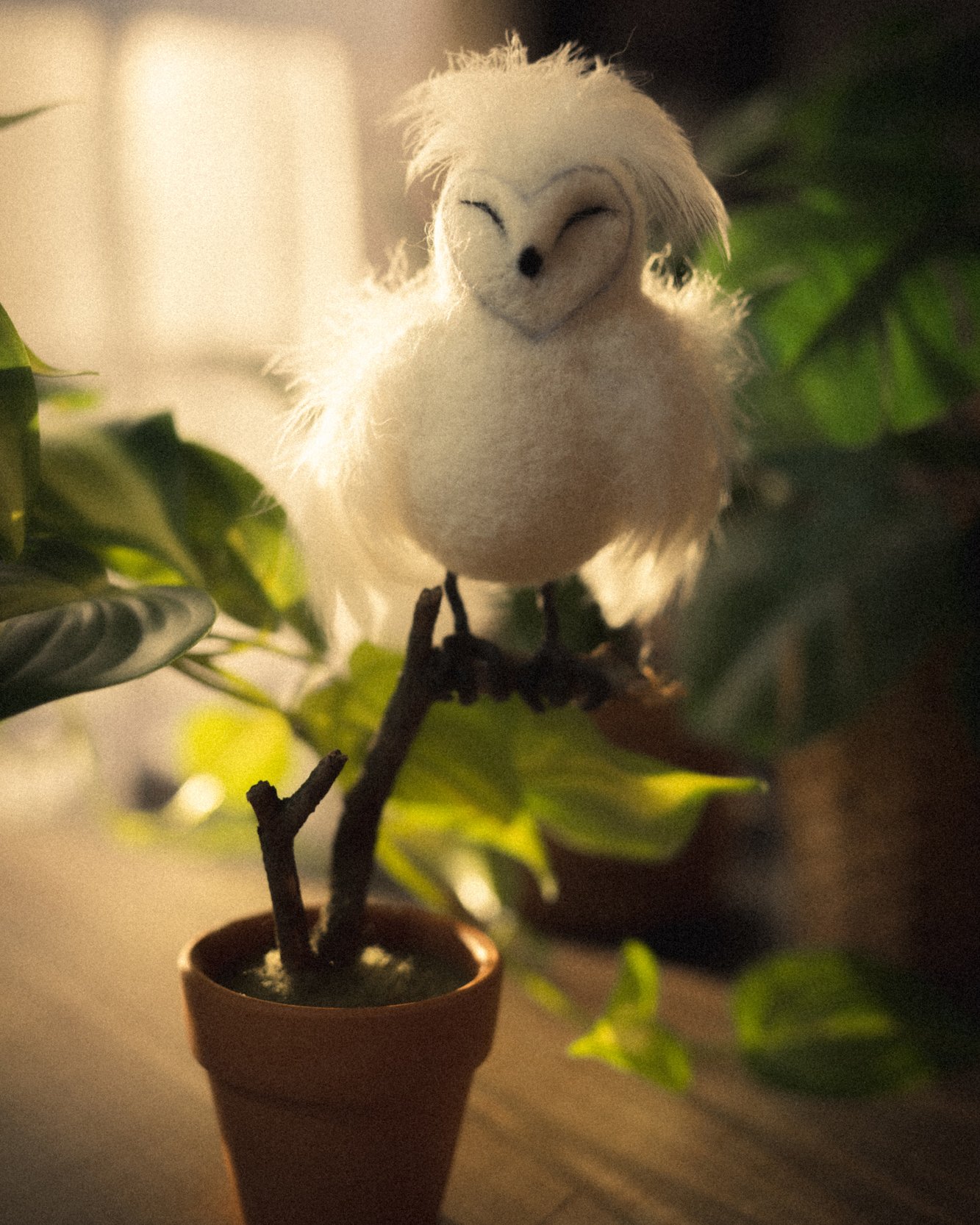 Peluches en laine cardée et feutrine, réalisée en feutrage à l’aiguille.